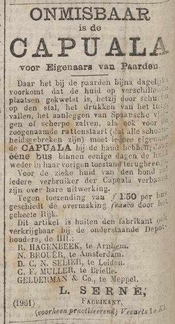 Advertentie over Capuala. Leon Serné heeft veel advertenties in kranten door het hele land geplaatst om dit kwakzalverij product te verkopen. Zelfs na zijn vertrek naar Engeland heeft hij dergelijke advertenties in Engelse kranten geplaatst.