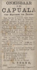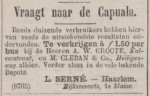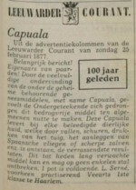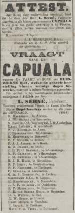 Advertentie over Capuala. Leon Serné heeft veel advertenties in kranten door het hele land geplaatst om dit kwakzalverij product te verkopen. Zelfs 100 jaar na zijn advertentie in de Leeuwarder Courant van 1877, werd er aan dit 'bijzondere' middeltje aandacht besteed.