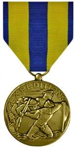 Navy Expeditionary Medal The General Orders of the Department of the Navy which established the medal states, “The medal will be awarded, to the officers and enlisted men of the Navy who shall have actually landed on foreign territory and engaged in operations against armed opposition, or operated under circumstances which, after full consideration, shall be deemed to merit special recognition and for which service no campaign medal has been awarded. The Navy Expeditionary Medal is retroactively authorized to February 12, 1874.” |