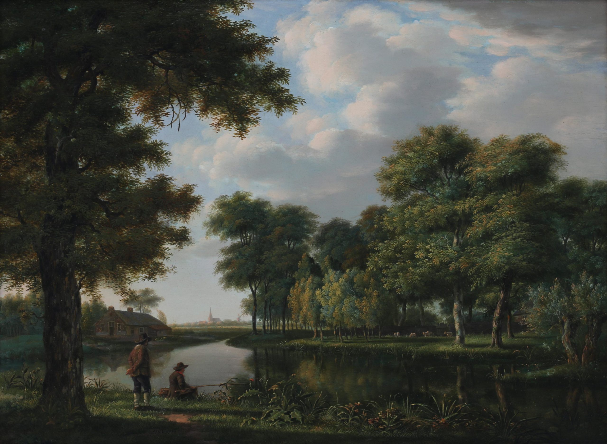 Home/Adrianus Serné/Kunstwerken van Adrianus Serné/Fishermen by a lake with a village in the distance