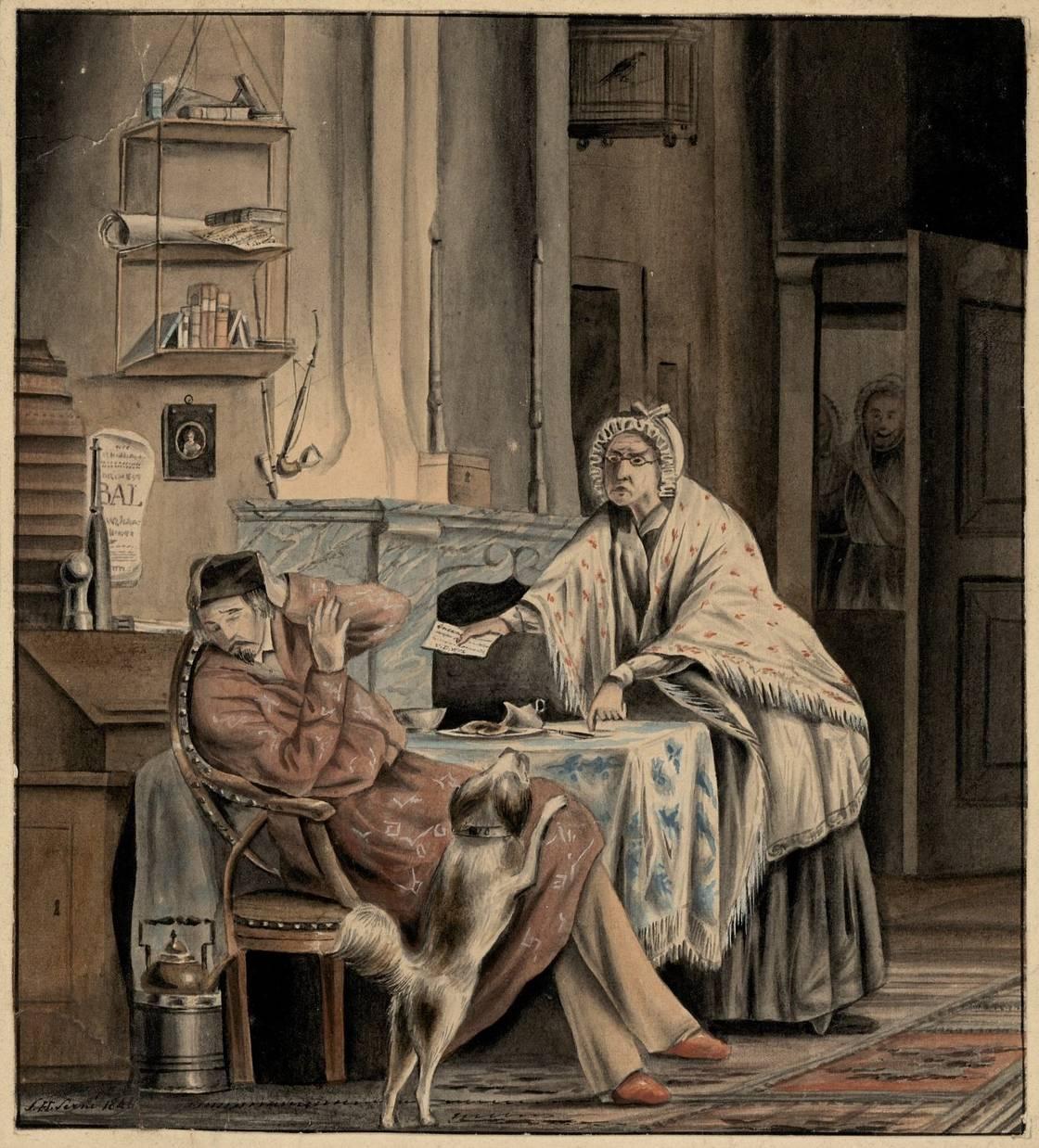 De beschrijving luidt: Vrouw scheldt haar man uit vanwege onbetaalde rekeningen, terwijl twee dienstmeisjes op de achtergrond afluisteren).
