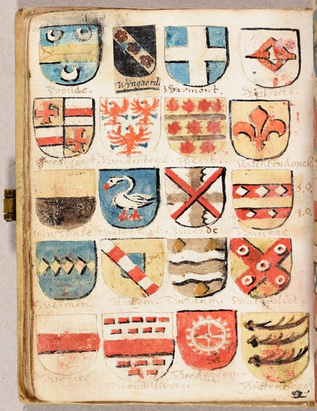 18mo, 13 x 9 cm: [94] e.v. + enkele blanco’s, met pen getekende wapenschilden, enkele uitgesneden uit gravure. wapenboeken en aangevuld met aquarel, bijschriften en aantekeningen in het Nederlands en het Frans (inc. verbruining en kleine vlekken). 18e eeuw perkament, messing sluiting, geschilderd wapenschild op rug (schutbladen vernieuwd). Goed exemplaar.